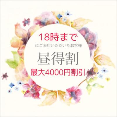 18時までにご来店のお客様限定 最大4000円割引!! 90分ご利用で2000円割引 120分ご利用で3000円割引 150分以上ご利用で4000円割引 でご案内させて頂きます♪♪ ご予約時に「昼割」と お伝えください