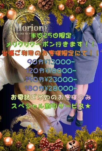 本日25日限定メリクリクーポン行きます!! 出張ご利用のお客様限定にて!! 90分¥13000- 120分¥18000- 150分¥23000- 180分¥28000- お電話ご予約のお客様のみのスペシャル割引サービス★ 是非、まずはお気軽にお問い合わせ下さい!!