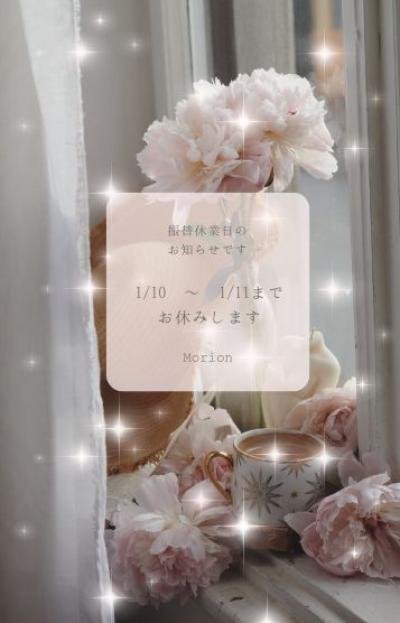 日頃当店をご利用頂き誠にありがとうございます。 年末年始と休業せずの営業を行い、本日10日・11日の二日間を振替休業日とさせていただきます 誠に勝手ではございますがご理解の程、よろしくお願い致します。 休業日中のお問合せ・事前予約・求人に関しまして一切のご対応をお休みさせて頂きます。 13日より通常営業9:00〜受付開始となりますのでよろしくお願い致します。 Morion〜モリオン〜