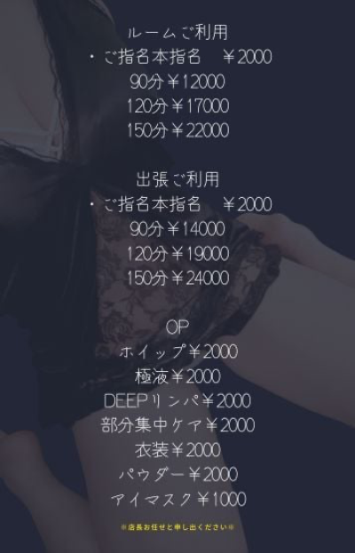 ルームご利用 ・ご指名本指名 ¥2000 90分¥12000 120分¥17000 150分¥22000 出張ご利用 ・ご指名本指名 ¥2000 90分¥14000 120分¥19000 150分¥24000 OP ホイップ¥2000 極液¥2000 DEEPリンパ¥2000 部分集中ケア¥2000 衣装¥2000 パウダー¥2000 アイマスク¥1000